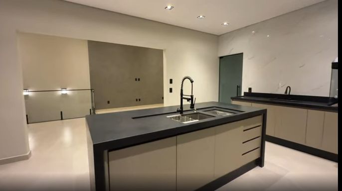 - Cozinha moderna com armários na parte baixa, fogão cooktop 5 bocas e ilha central